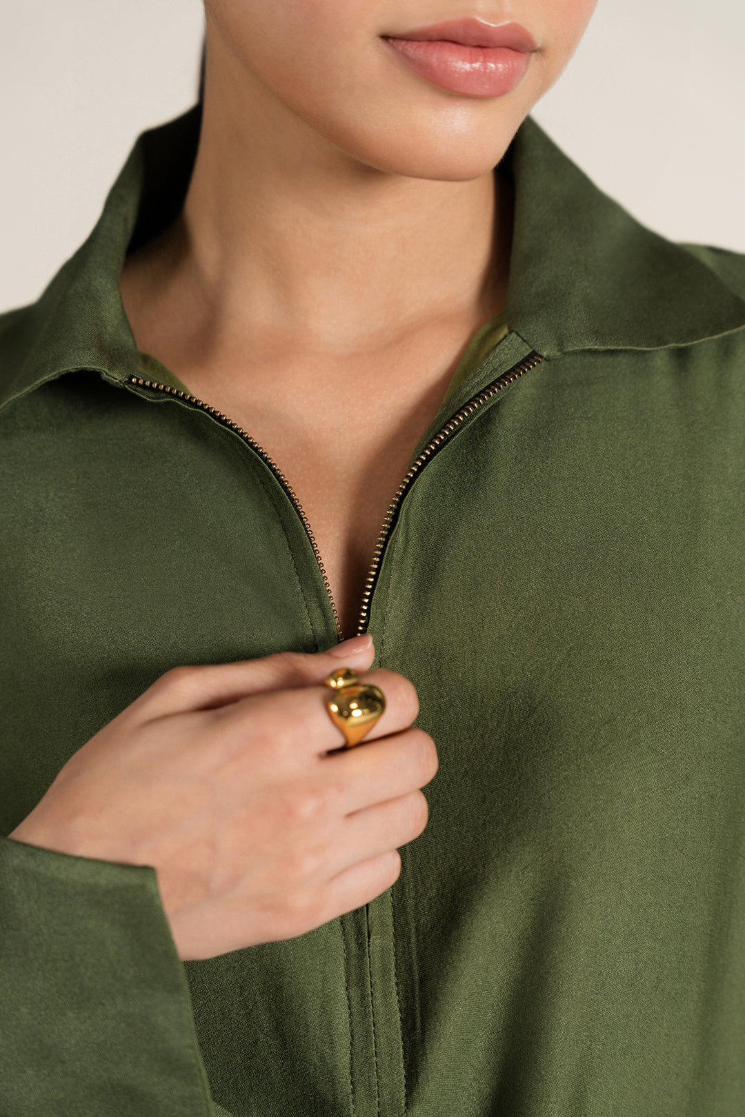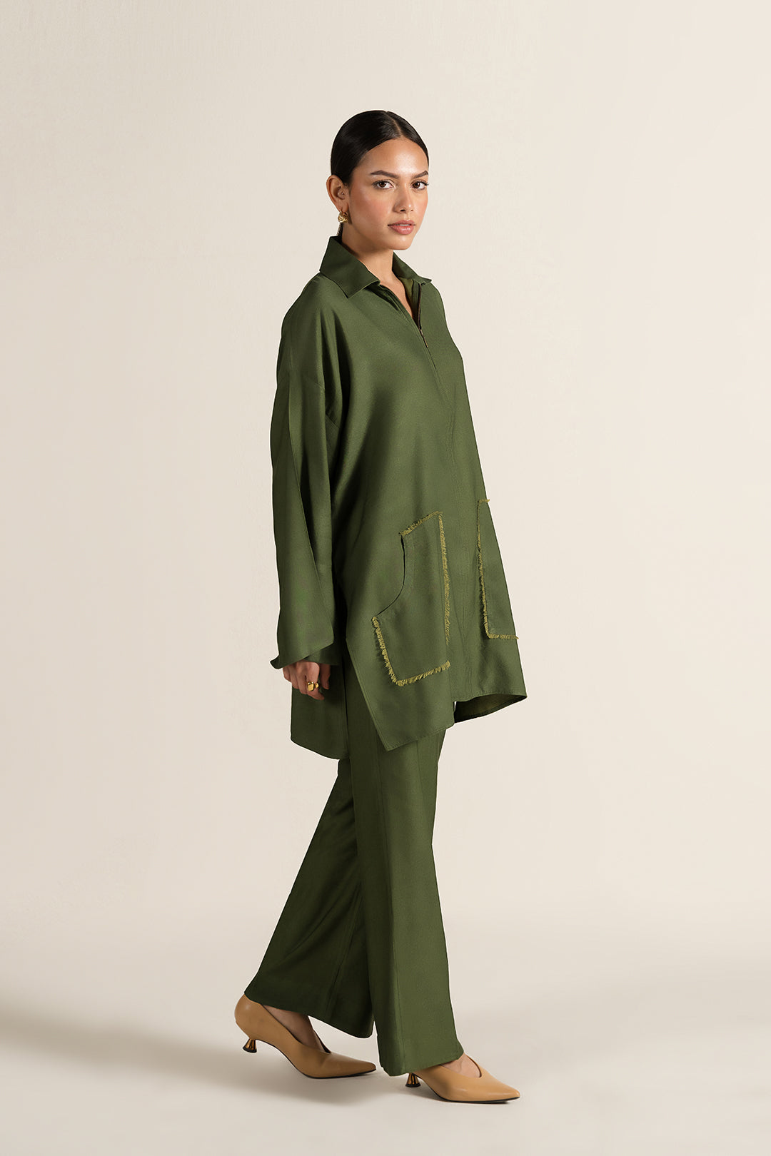 • Crafted in soft poly viscose, this top features a one-piece collar with a half-zip front closure and a center-front seam. Designed with dropped shoulders, straight sleeves with slit detailing, a center-back seam, and front patch pockets with frayed edges for a contemporary, relaxed look.