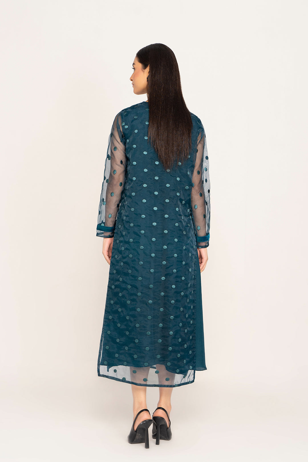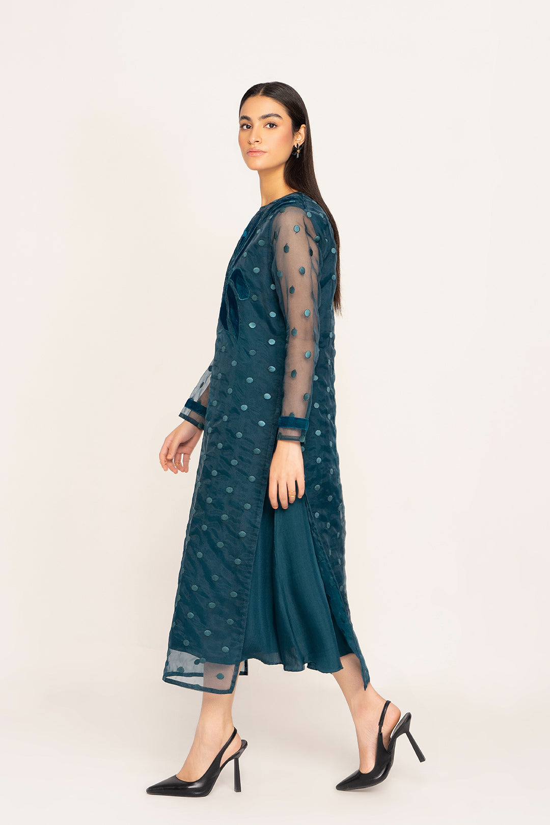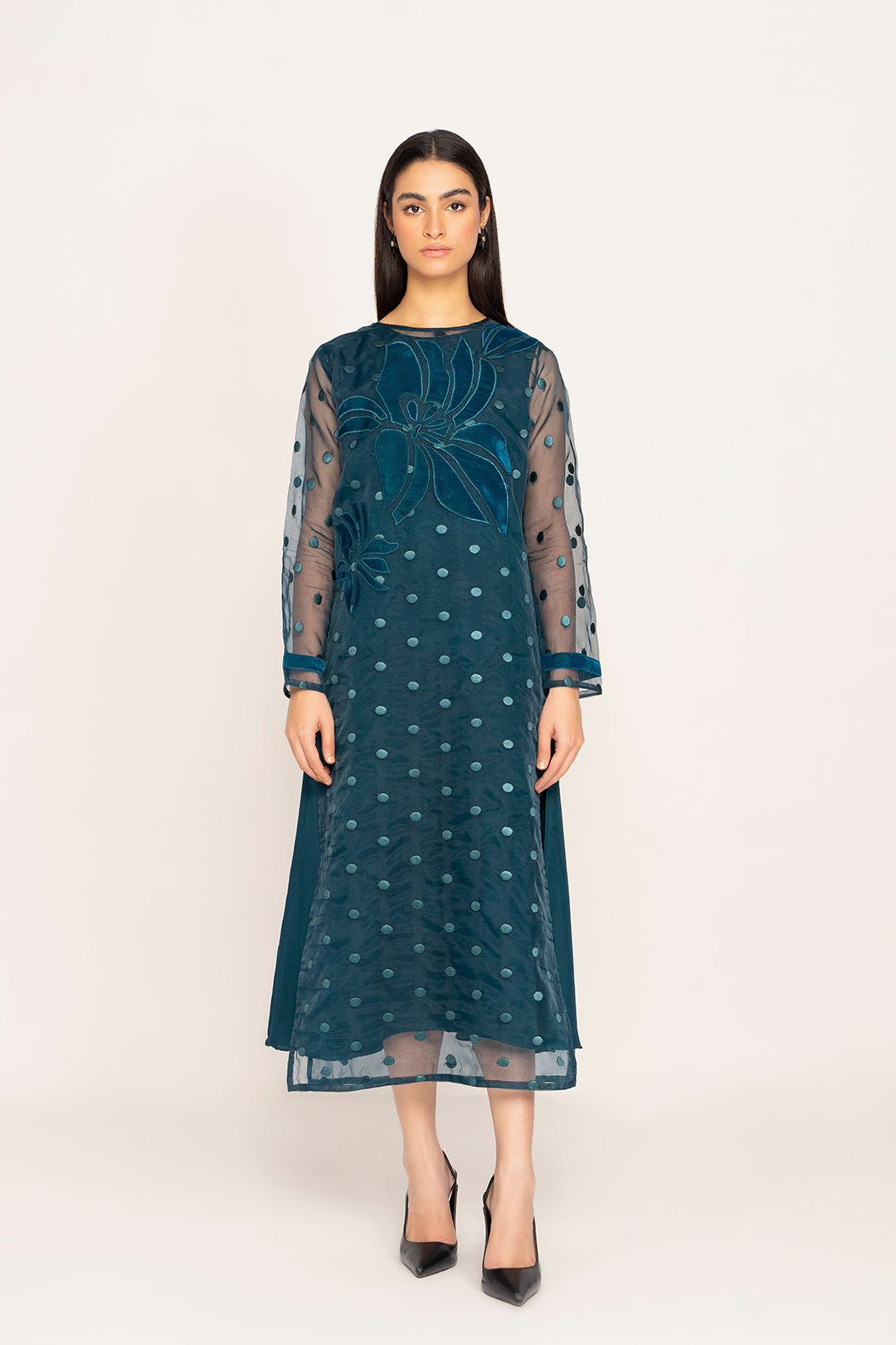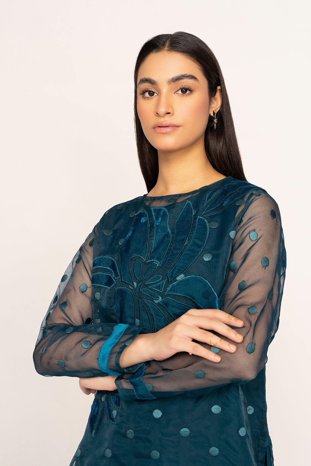 This long shirt made in embroidered organza with applique detail on front, features a crew nckline with hook & eye closure on the back , basic full sleeves with velvet detail and a straight hem with side slits. It comes with a viscose under shirt. Length 48" Model is wearing size S. Model height 5'4"