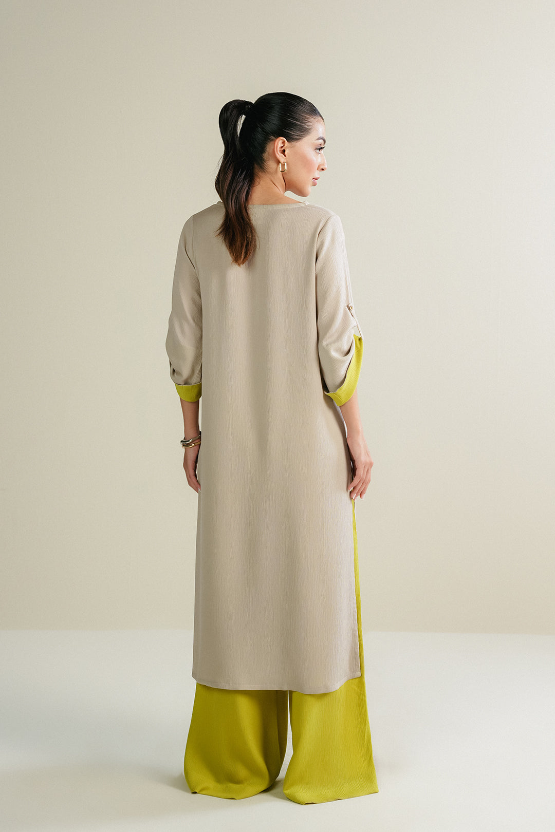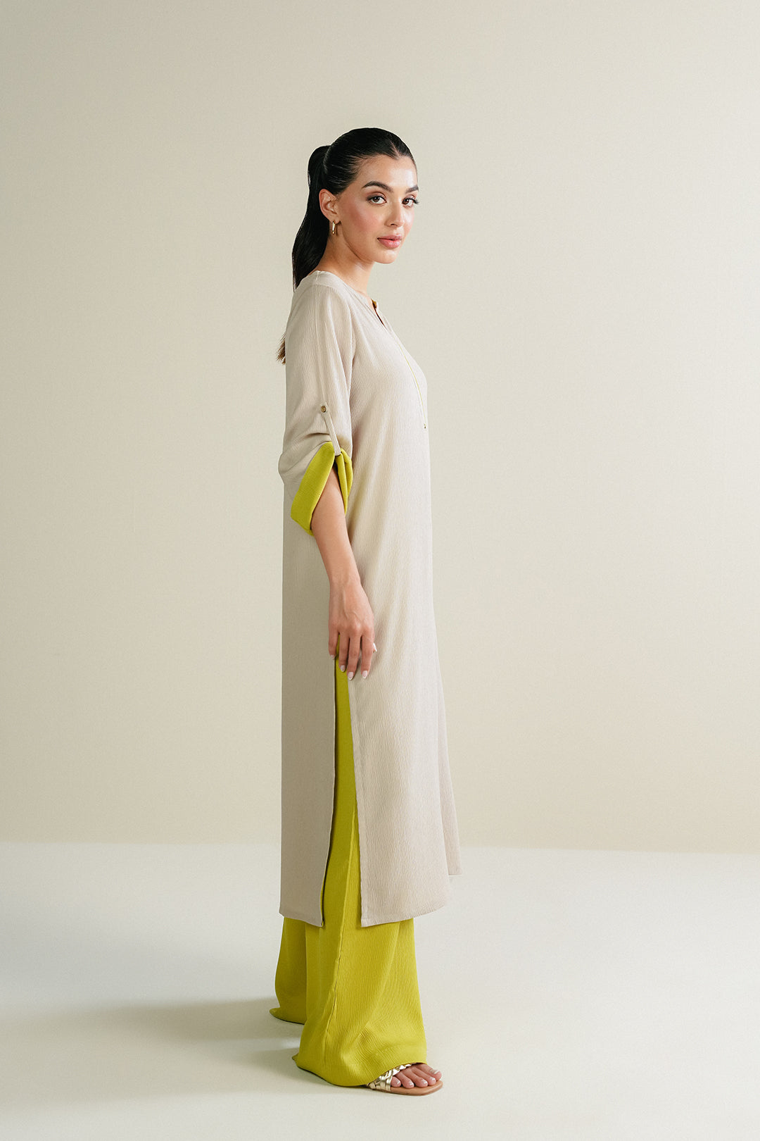 This long top made in mocha soft crinkle fabric features crew neck with v-cut, placket with contrast embroidery.