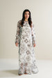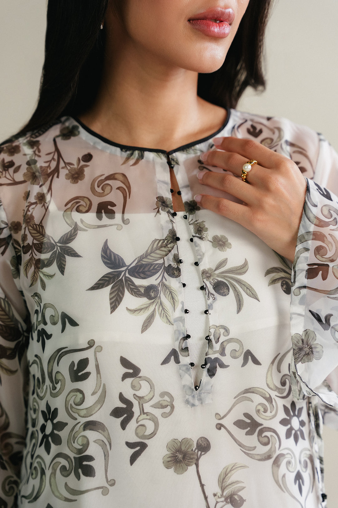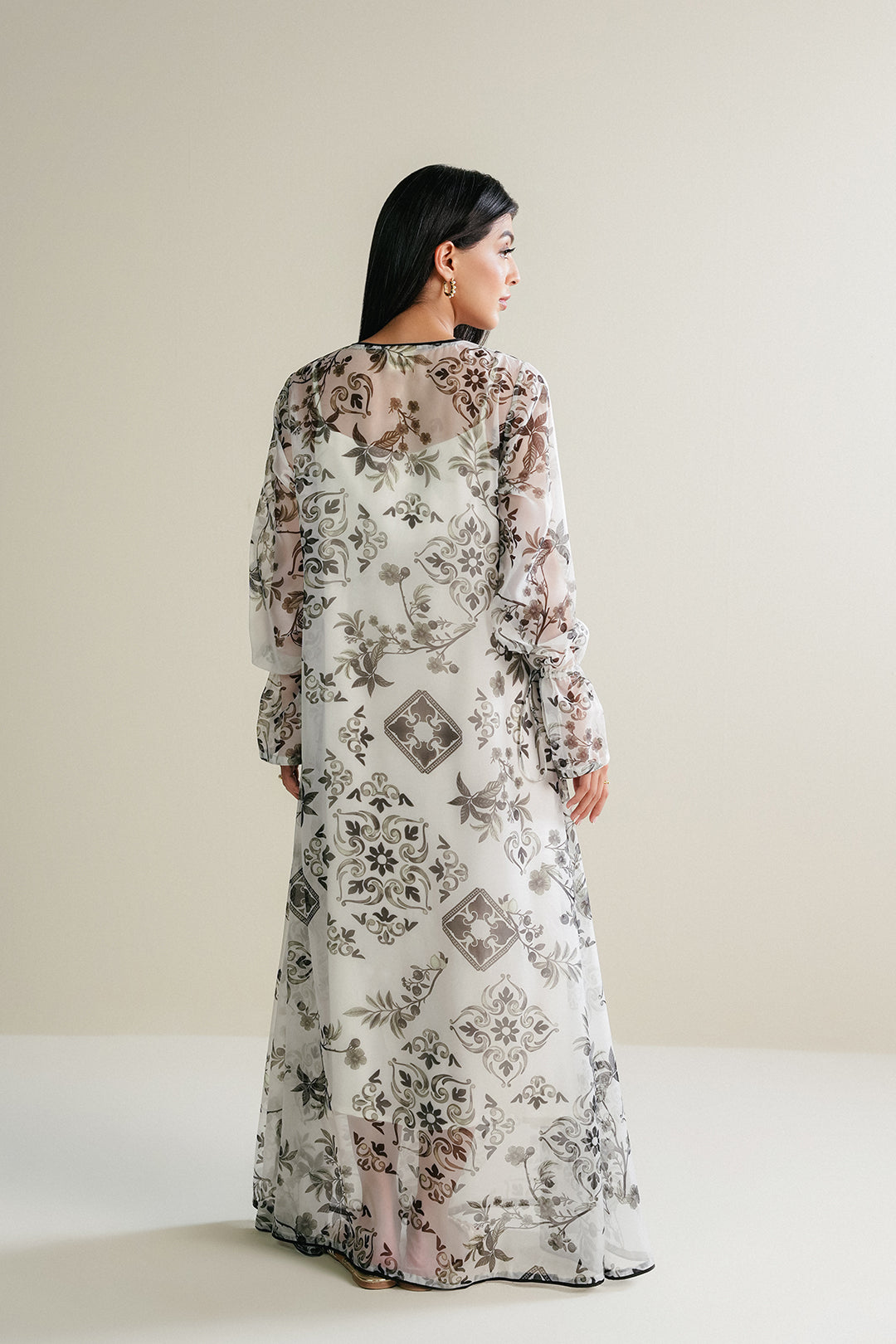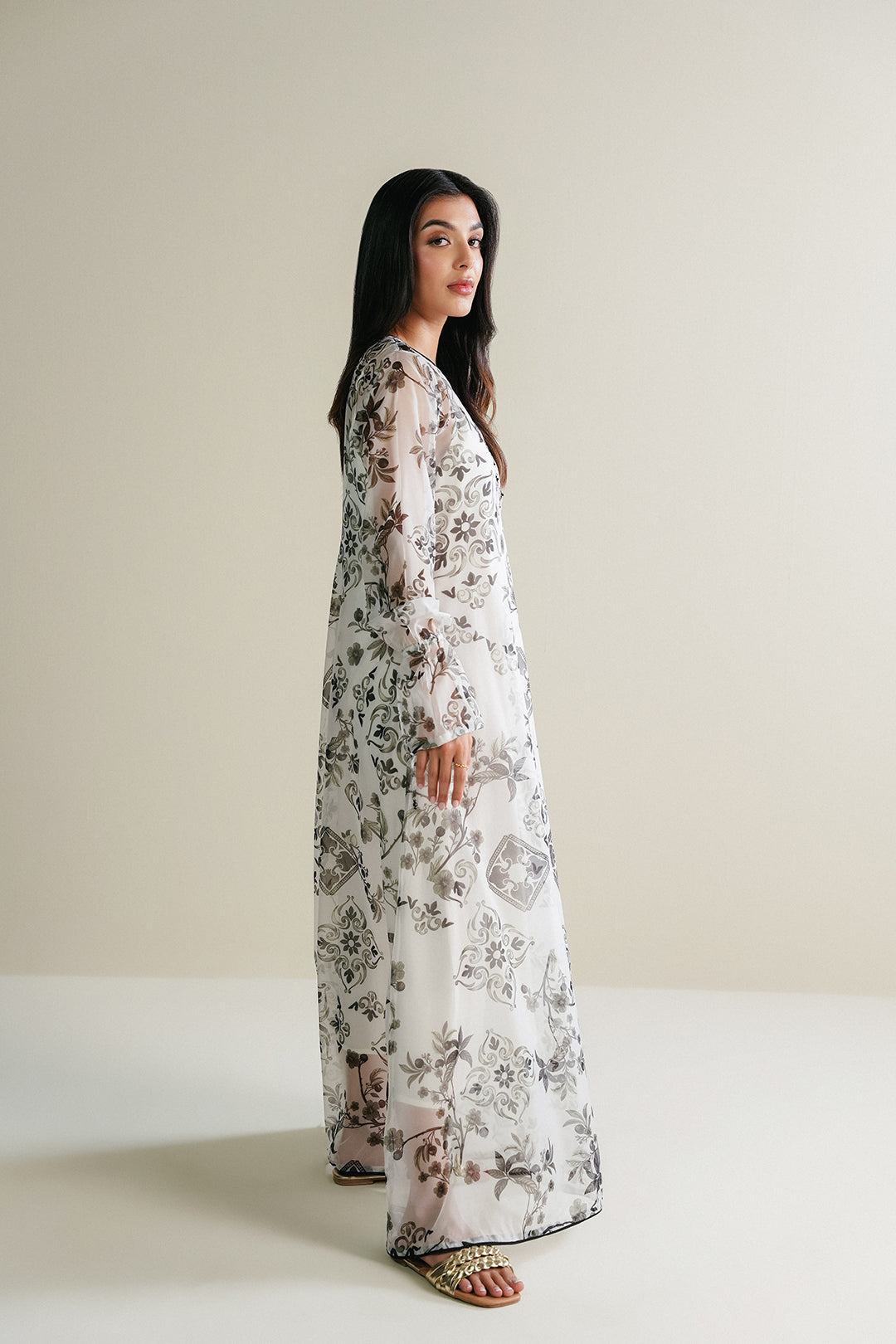 This dress made in black and white soft sheer poly silk fabric in floral print features crew neck.