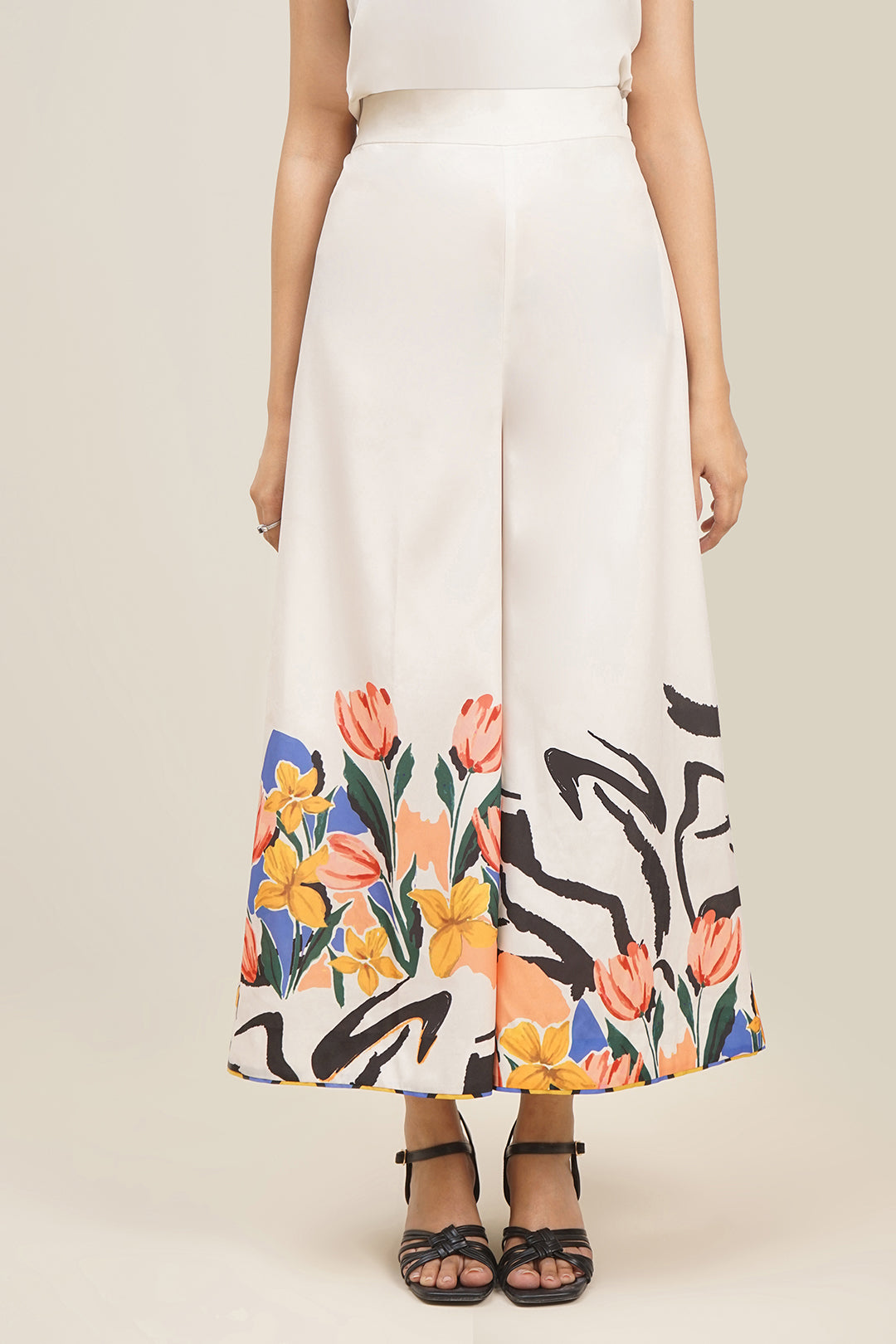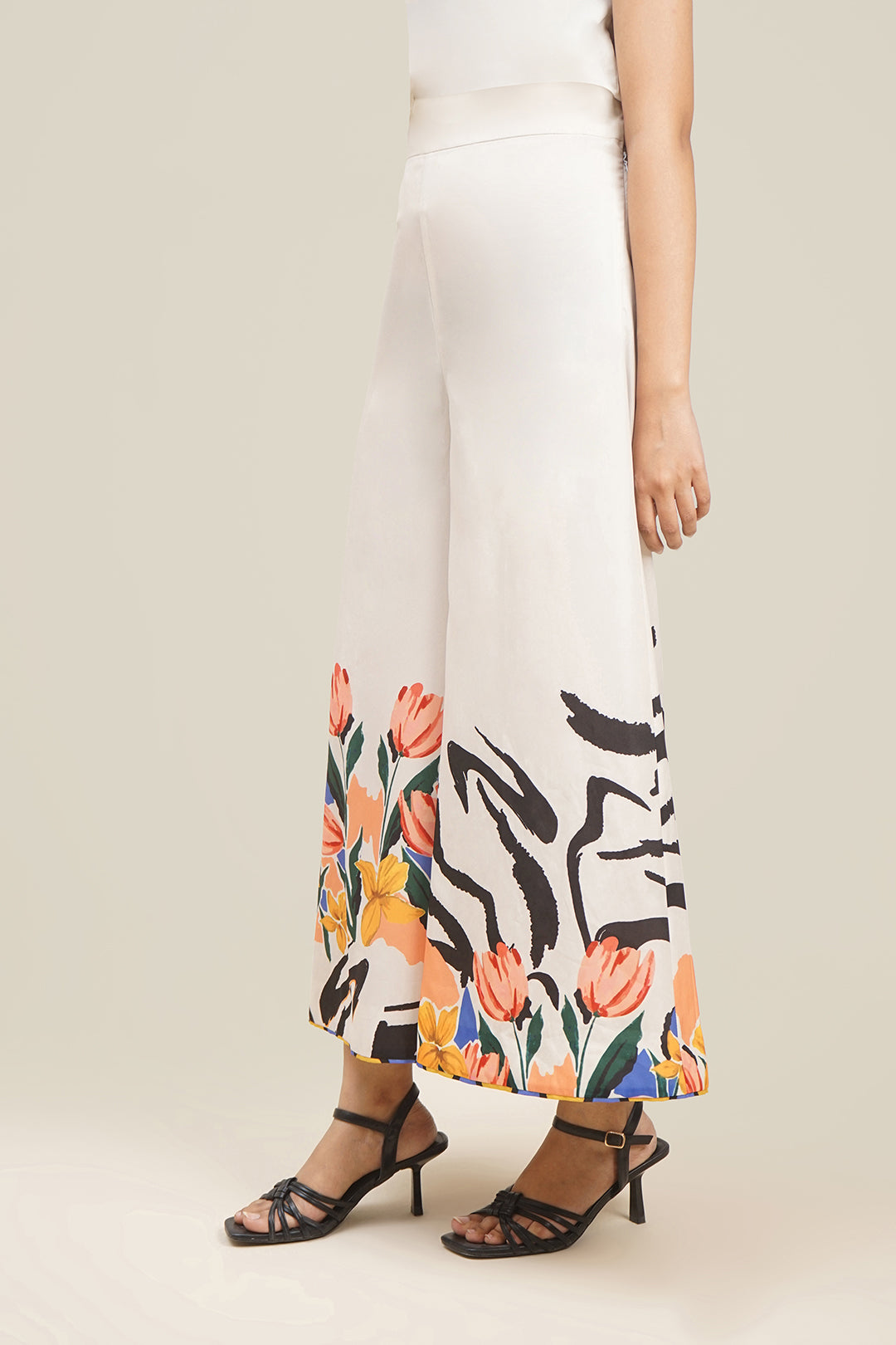 Off-white flared pants made in soft crepe fabric in animal & floral print.
