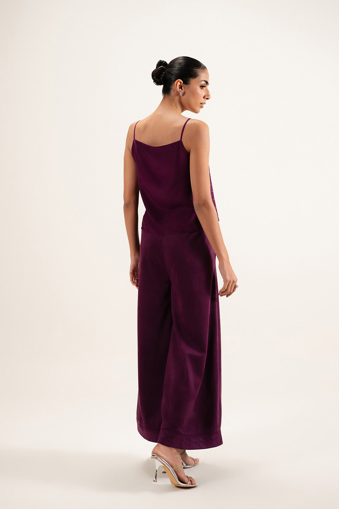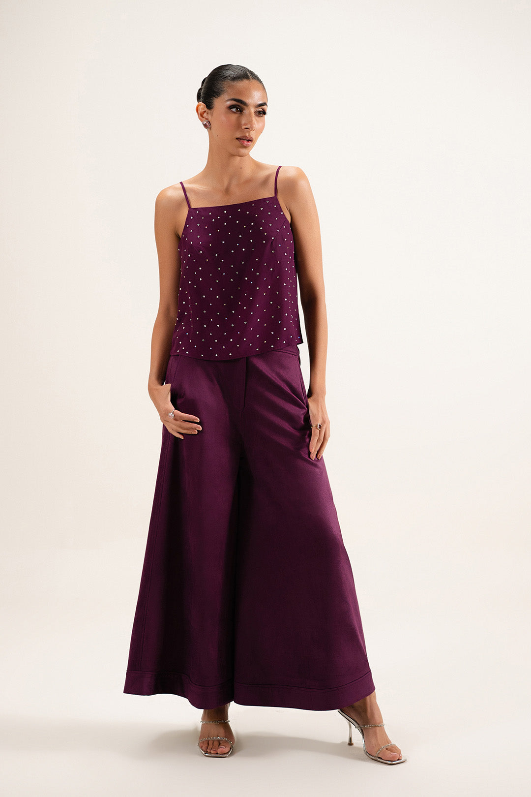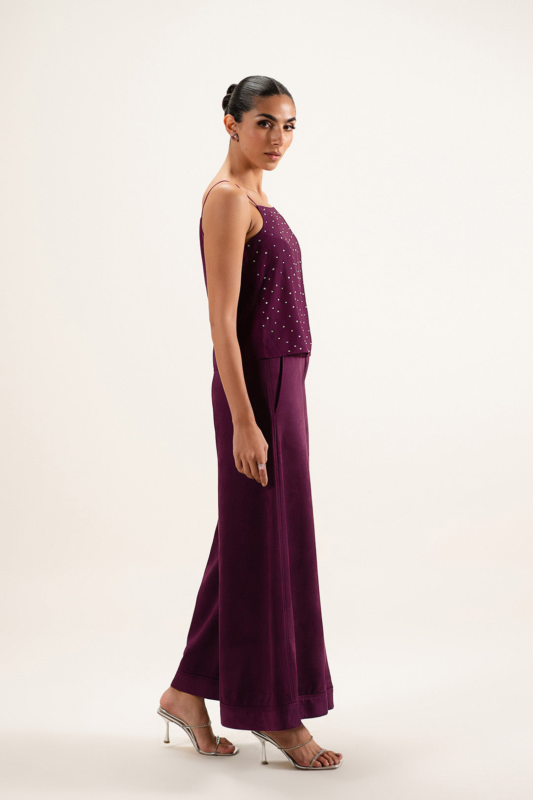 Crafted in crepe, this top features delicate spaghetti straps with a structured bust dart and facing at the neckline. Finished with embellishment on the front.
