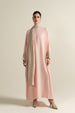 Crafted in soft crinkle crepe. This abaya features a crew neckline with a quarter invisible zipper at the front, batwing sleeves, and contrasting cuffs adorned with elegant running stitch embroidery. Pair it with pink colorblock stole to complete the look.