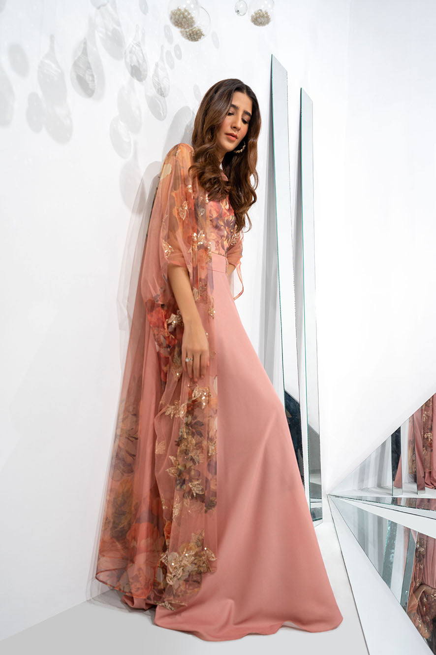 This lined light pink sleeveless net crop top with floral print features a boat-neck, waist darts and a side zip-closure. It comes as a pair with a matching embroidered shrug that features a front-open silhouette and batwing sleeves. Crop Top Length 15'', Shrug Length 50''. Model is wearing size S. Model height 5'7''