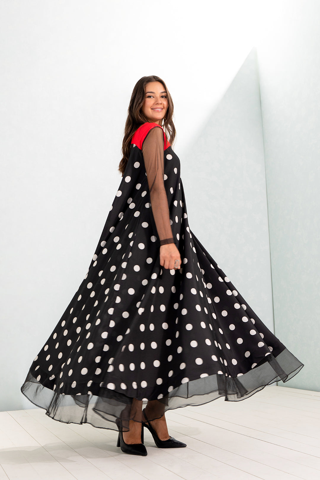 • This black and white dress made in soft crepe fabric in polka dots print features contrast yoke, crew neckline, full-length sleeves in black net fabric, flared hem with organza detail