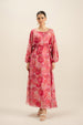 This foral printed georgette chiffon dress features a square neckline and full-length puffed sleeves with elasticated openings. Designed with a drawstring waist and a flared silhouette for graceful movement, it comes with an attached lining for added comfort.
