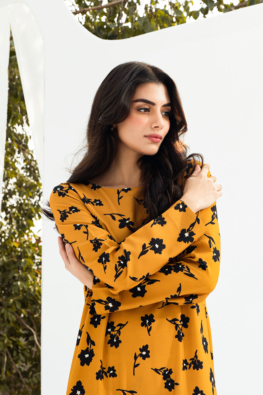 This long mustard and black flared dress with floral pattern is made in soft crepe features a front crew neck with back neck slit and full sleeves Length 50"