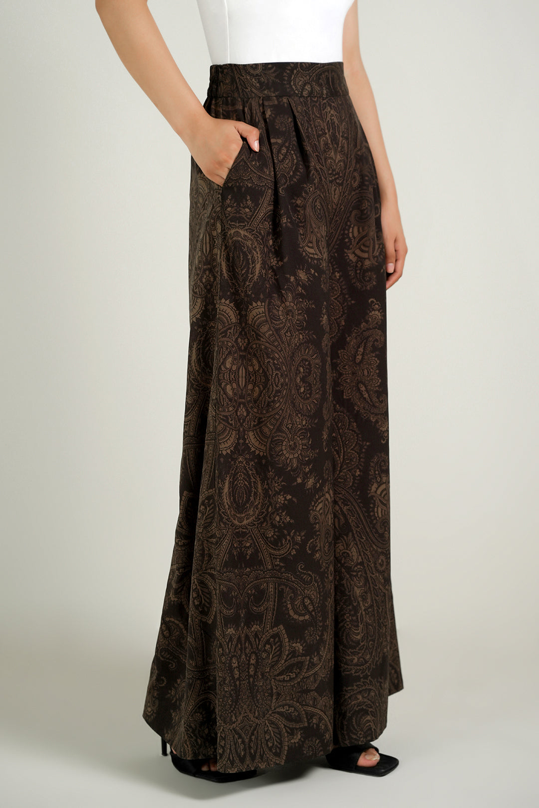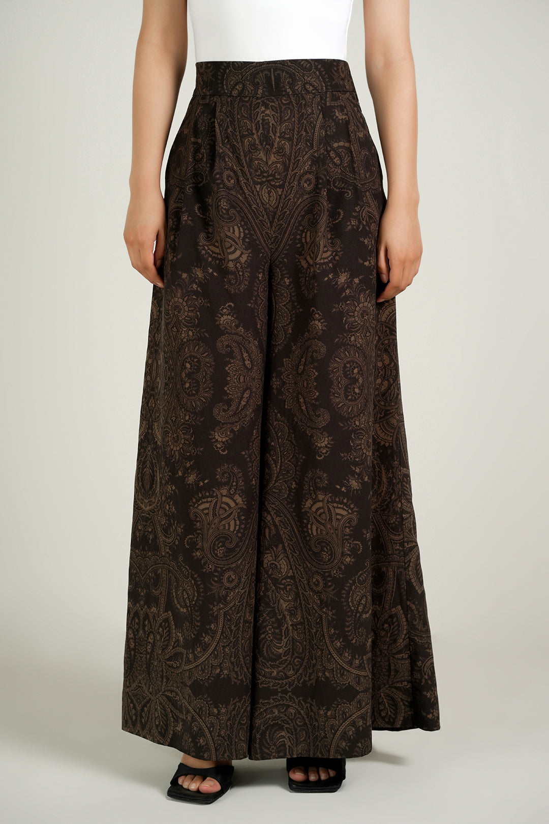 These flared pants made in soft crepe fabric in print features semi-elasticated waist band, side zipper opening, hook & eye closure.