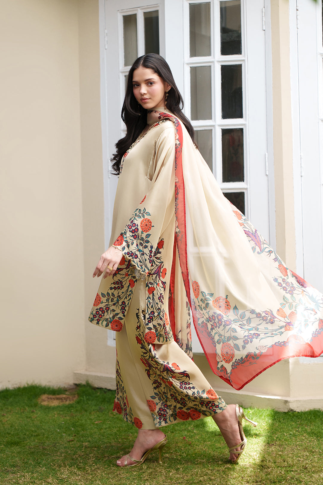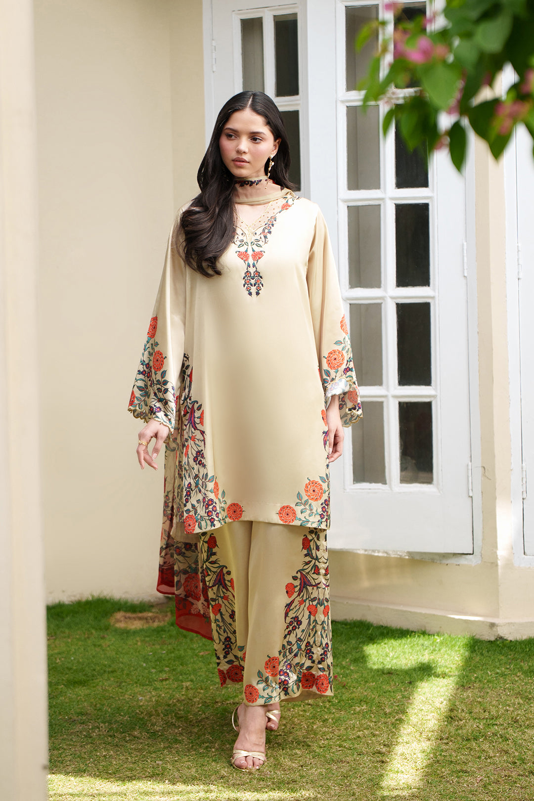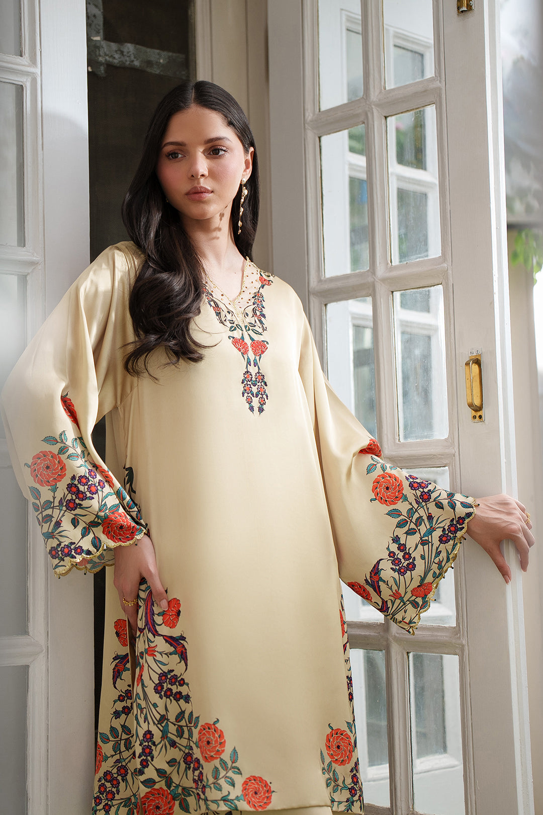 This top is made from printed charmeuse silk fabric. It features a V-shaped neckline with organza insertion, press-on baitki, and badla embroidery on the neckline. It has a square armhole with flared sleeves, scallop detailing, and crystal hangings around the sleeve opening. It includes side slits and a straight hem.