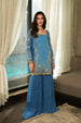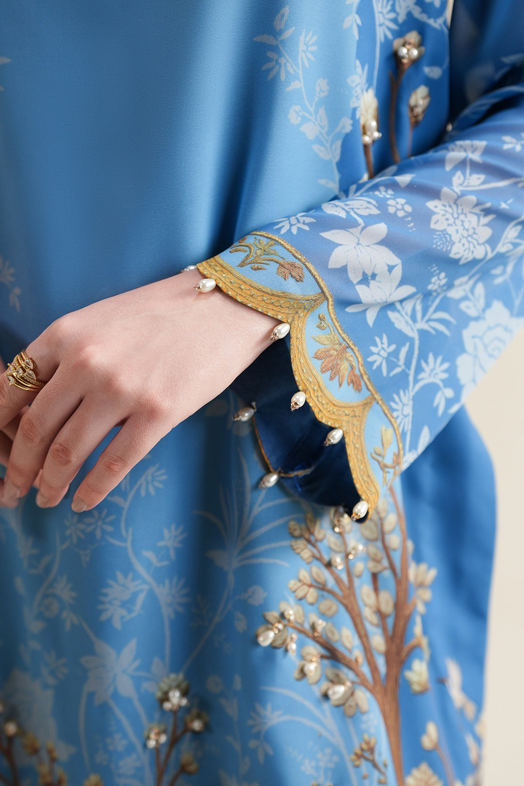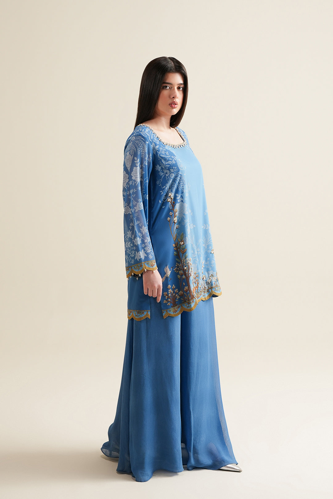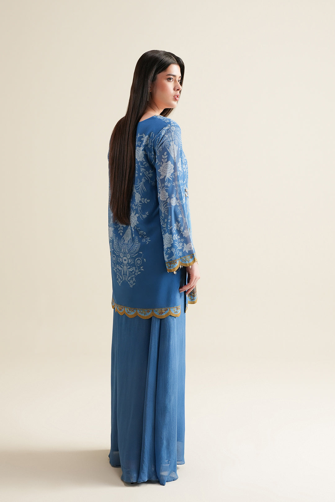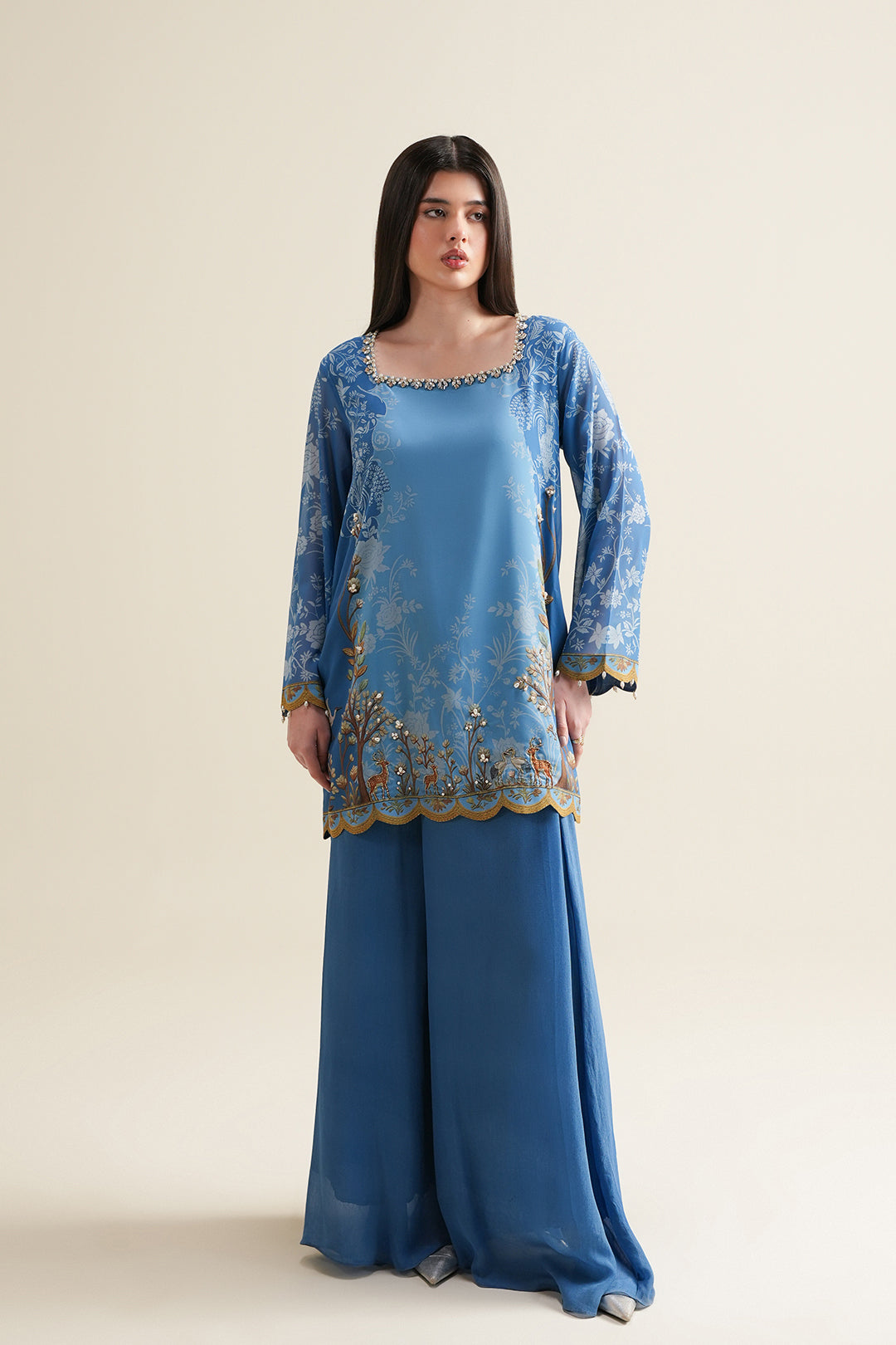Crafted in soft georgette chiffon, this piece features a square neckline with neck embellishment and embellishment on the printed bottom area. Designed with slightly flared sleeves with pearl hangings at the openings, and facing at the sleeves and bottom. Finished with a scalloped bottom and sleeve openings with facing, and an attached inner for added coverage.