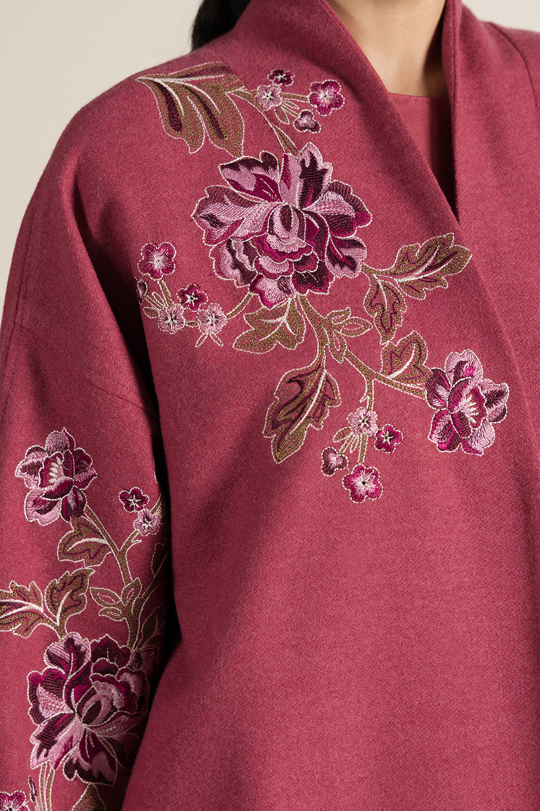 • Crafted in soft wool, this embroidered coat features an extended neckline with darts and shoulder dart detailing. Adorned with multihead embroidery on the right front and right sleeve, it is designed with dropped shoulders, straight full-length sleeves with front darts, and yoke detailing throughout the sleeves. Topstitch detailing throughout and a center back seam enhance the tailored finish, while an attached silk lining adds a luxurious touch.