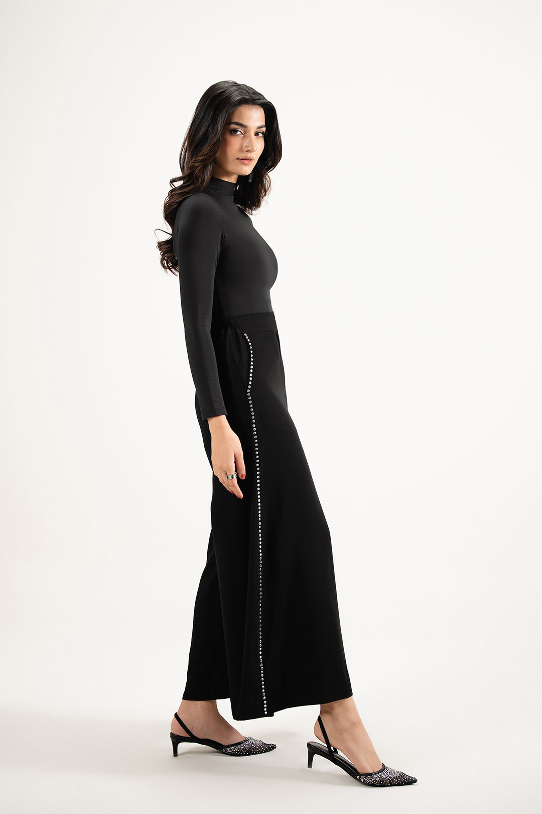 Crafted in soft black crepe, these pants feature a hook-and-eye and invisible zipper fly closure with an elasticated side waist belt. Designed with a flared bottom finished with facing.