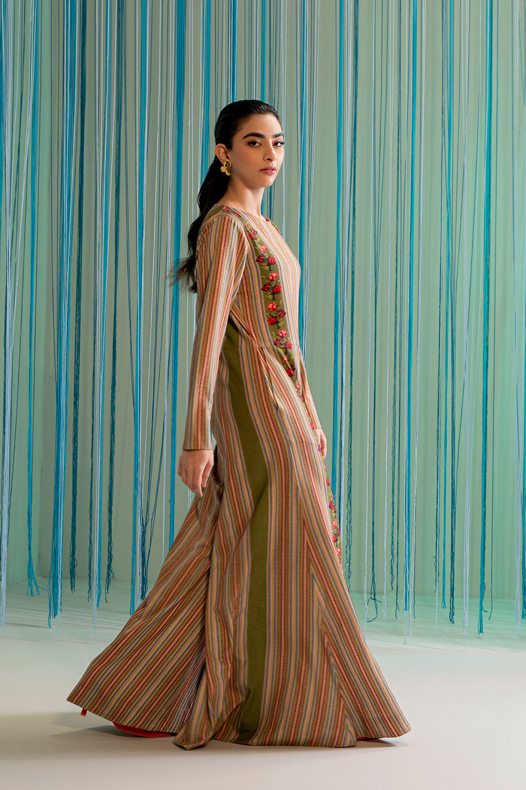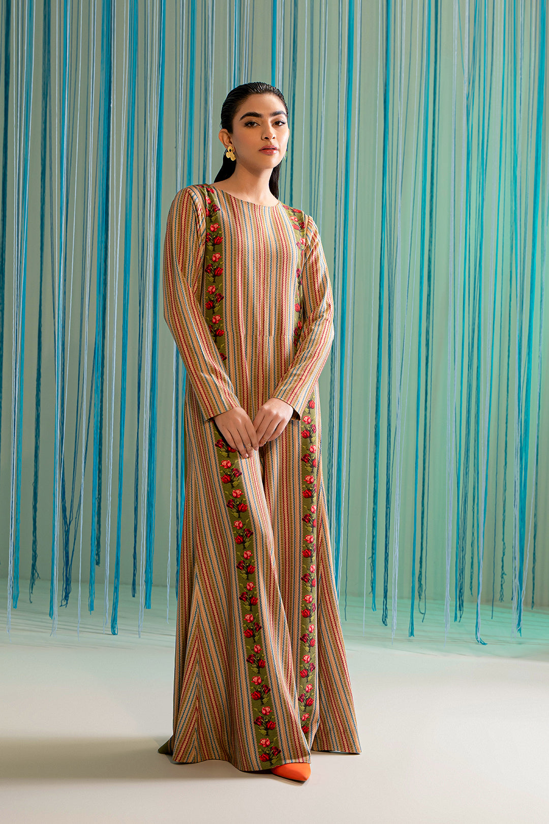 This jumpsuit made in soft crepe fabric in textured-stripes print, features a crew neckline, center back zip closure, flared bottom and full-length sleeves. Length 57". Model is wearing size S, Model height is 5'6