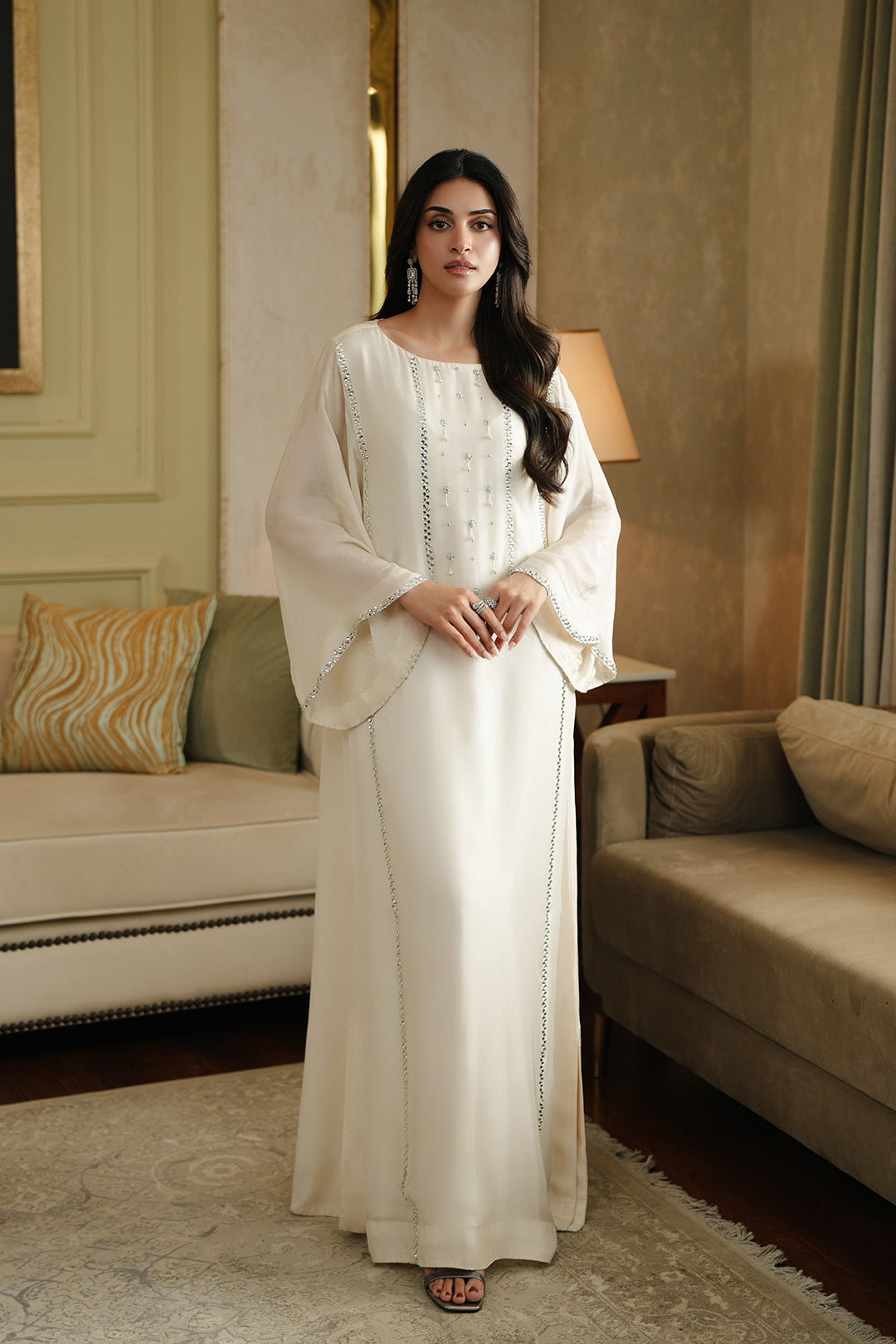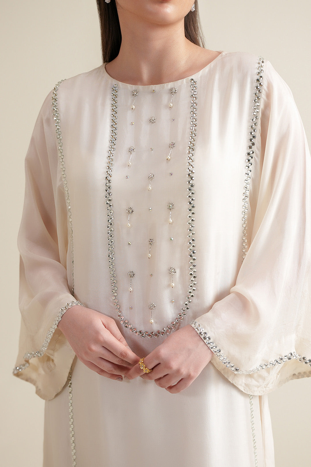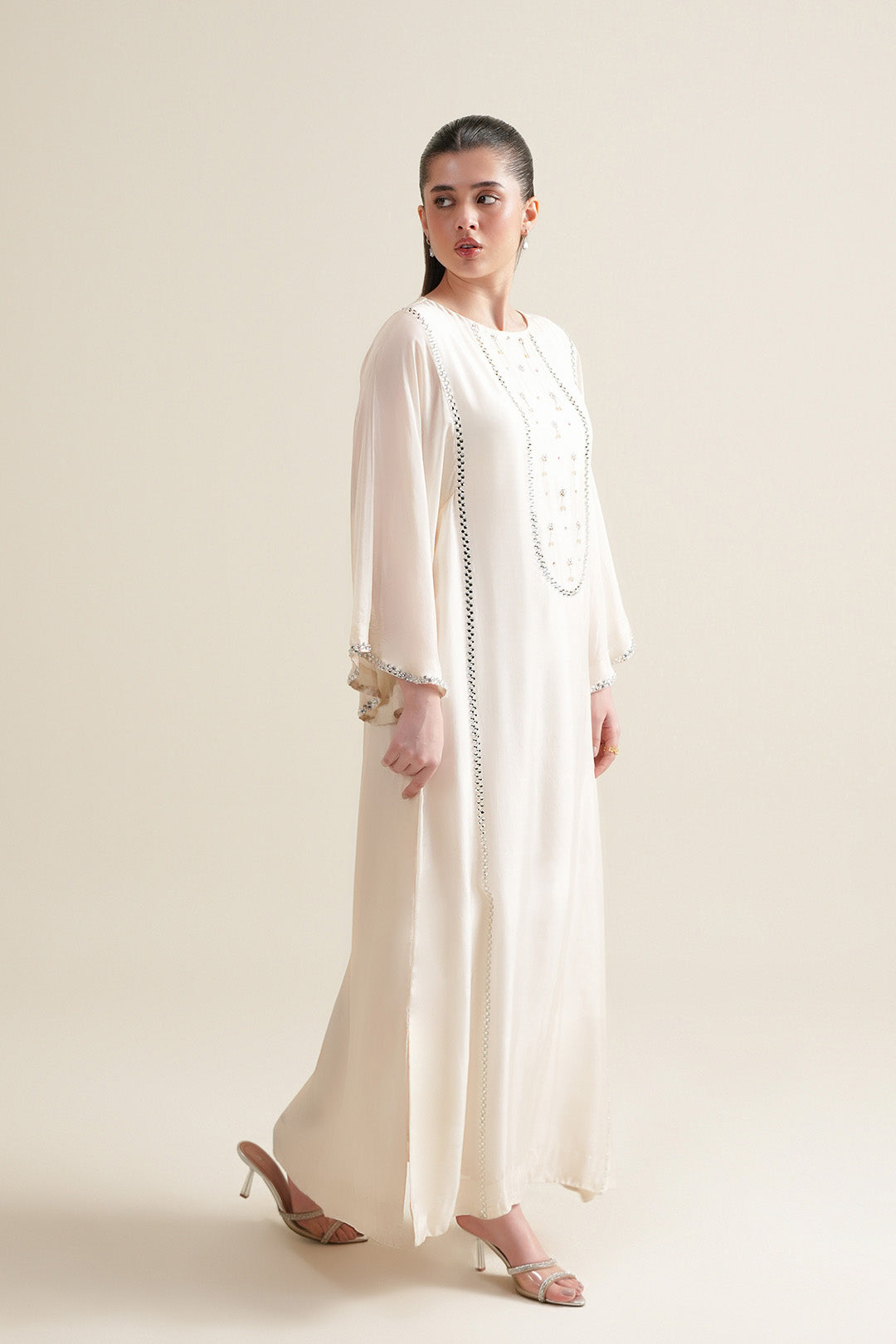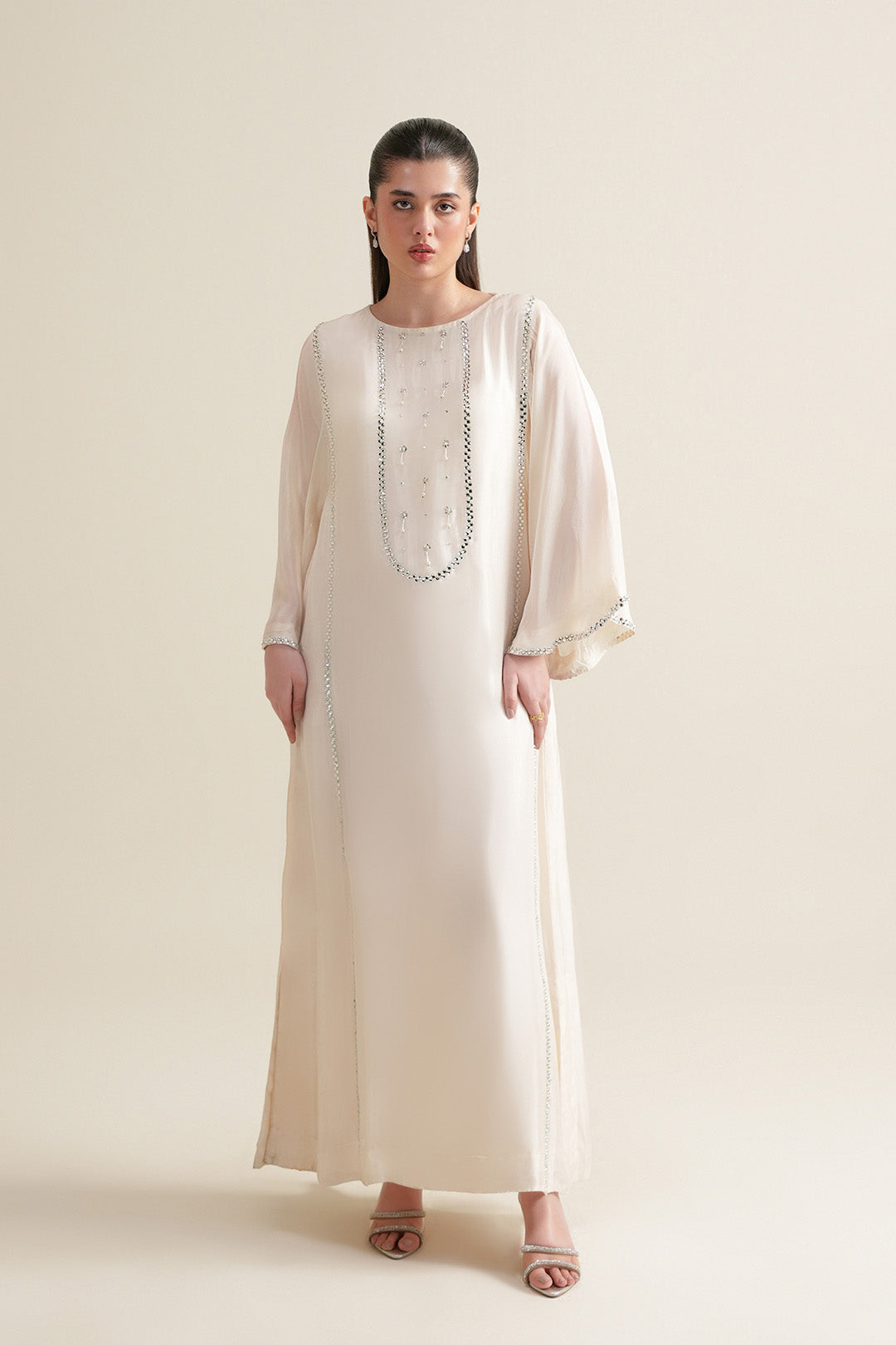 This medium silk dress features a crew neckline with a back neck slit and embellished front. Designed with flared sleeves, adorned with all-over chatta embellishment. Finished with an attached lining for a clean and polished silhouette.