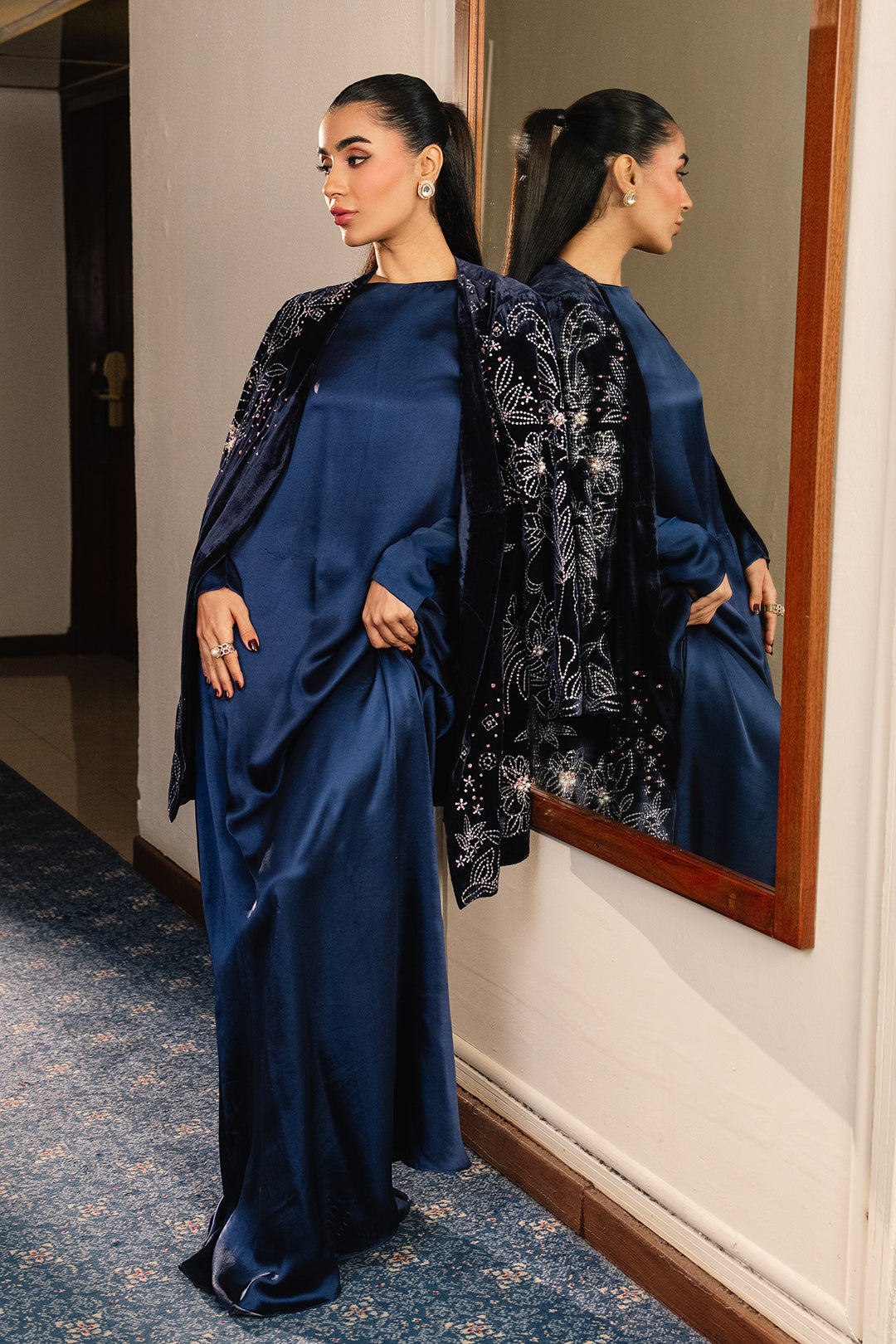 • This deep blue velvet jacket is heavily embroidered and embellished with silvers, pinks and pearls. The neckline features a front-open overlap detail for a tailored look. Pair with "Teraal Dress" to complete the look.