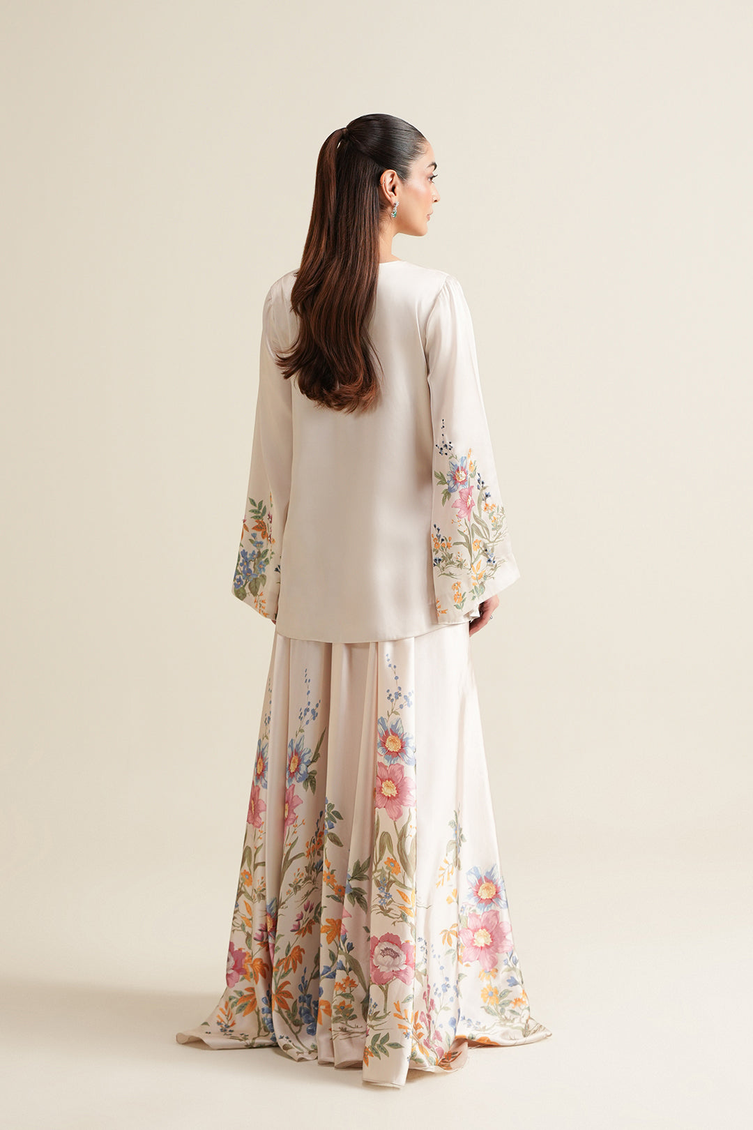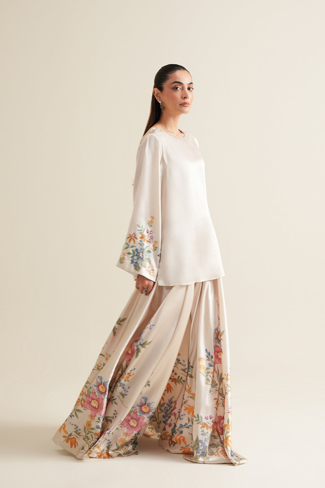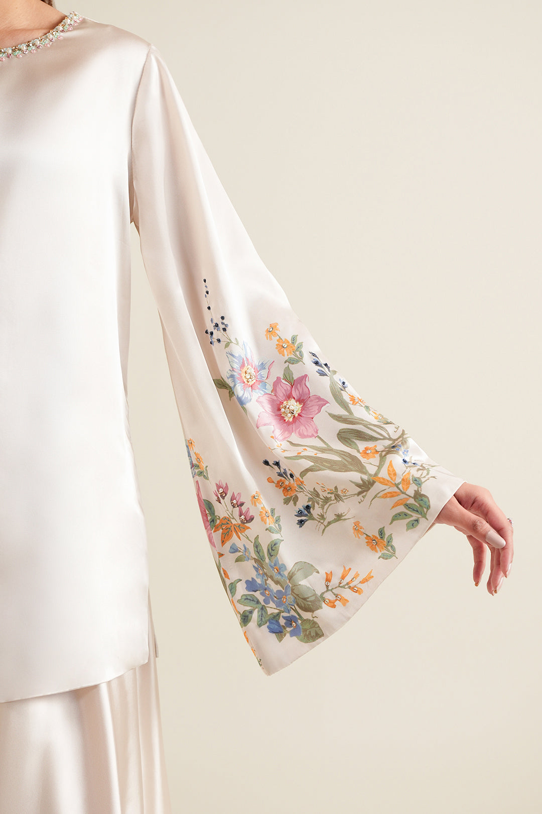 Crafted in soft charmeuse silk, this piece features a crew neckline with a back neck slit and full-length sleeves finished with flared openings. Designed with side slits and a straight bottom, and finished with embellishment on the front neckline and sleeves.