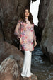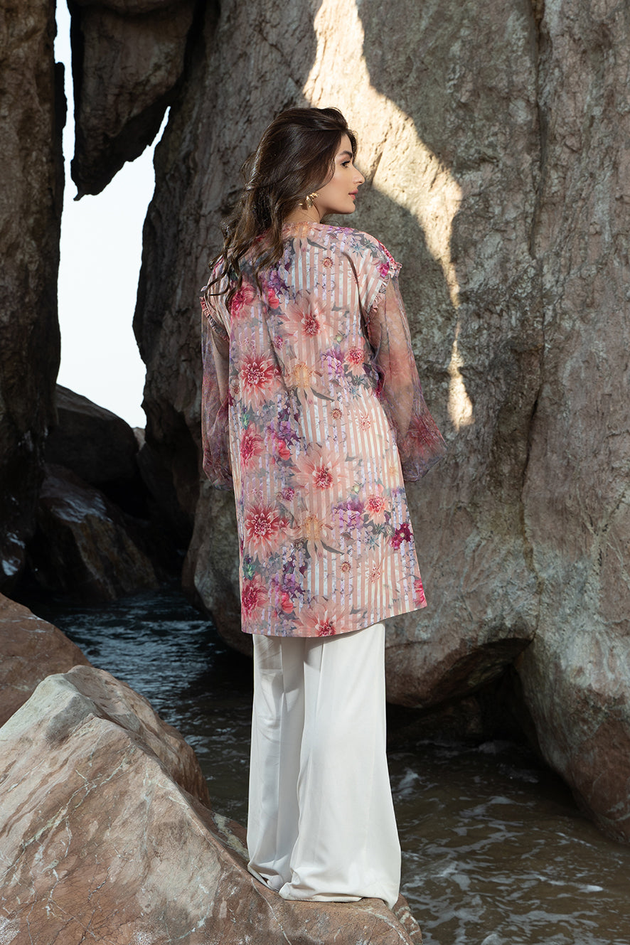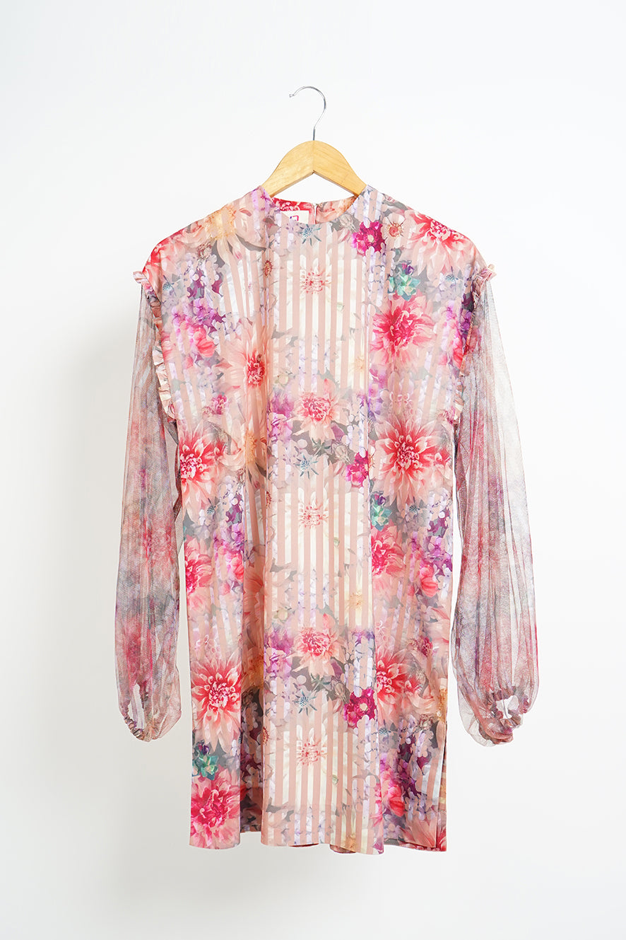This multicolored mid-length top with diffused floral and stripes print made in soft crepe fabric features a crew-neck with hook & eye closure at the back, drop shoulders with ruffle detailing around the armholes, full-length net sleeves with elasticated openings and side-slits.