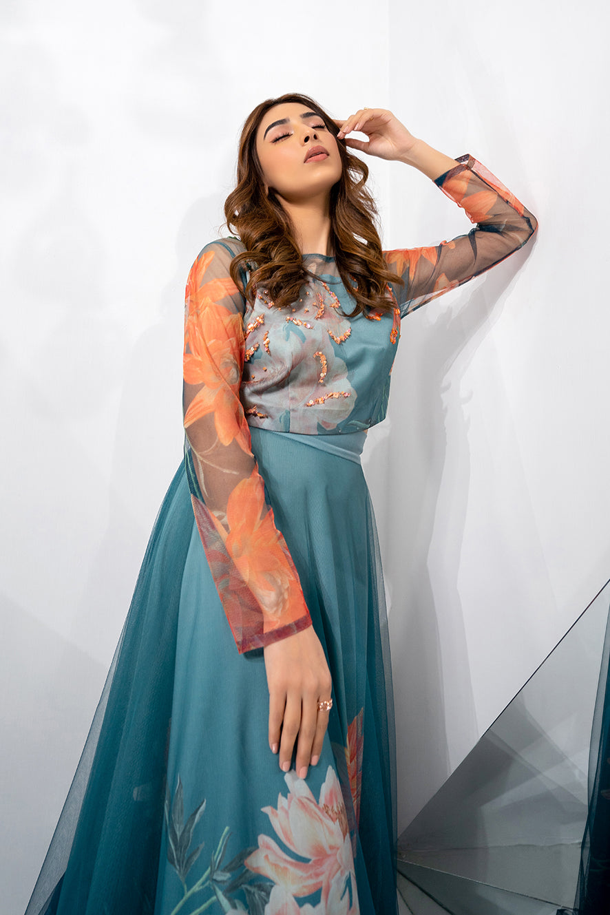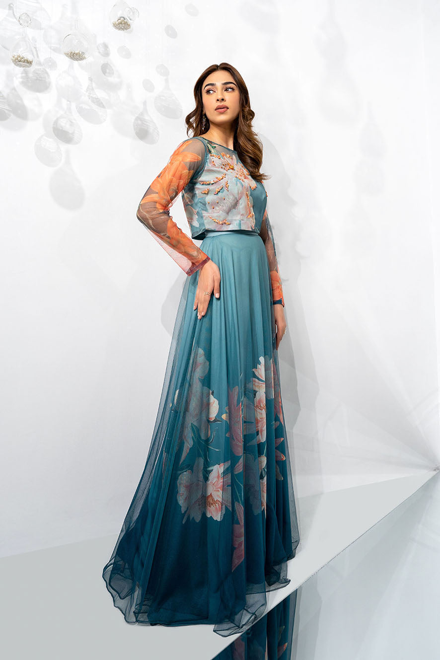 This multicolored net crop-top with floral print and embellishment features a boat-neck,full-length sleeves, waist darts and side zip-closure.It is lined with matching crepe from below the yoke. Length 15''. Model is wearing size S. Model height 5'5''.