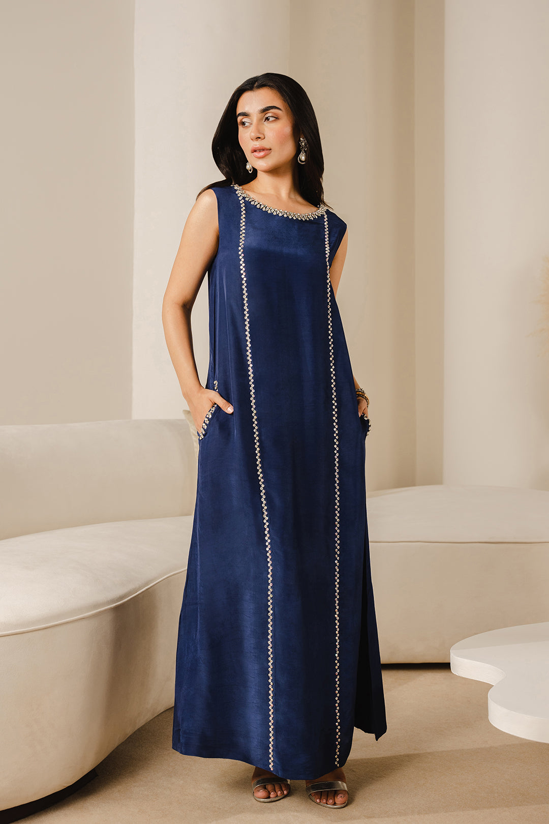 Sleeveless dress made in soft silk fabric, features crew neckline adorned with crystal embellishmen.