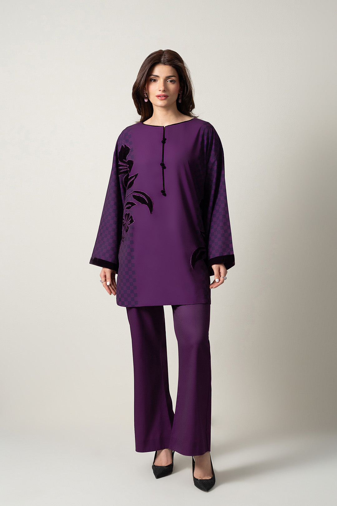 This top made in soft crepe fabric features crew neck with piping detail on neckline, drop shoulders, full length flared sleeves with velvet cuffs, side slits and round bottom hem. The top has patchwork detail on front.