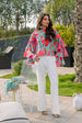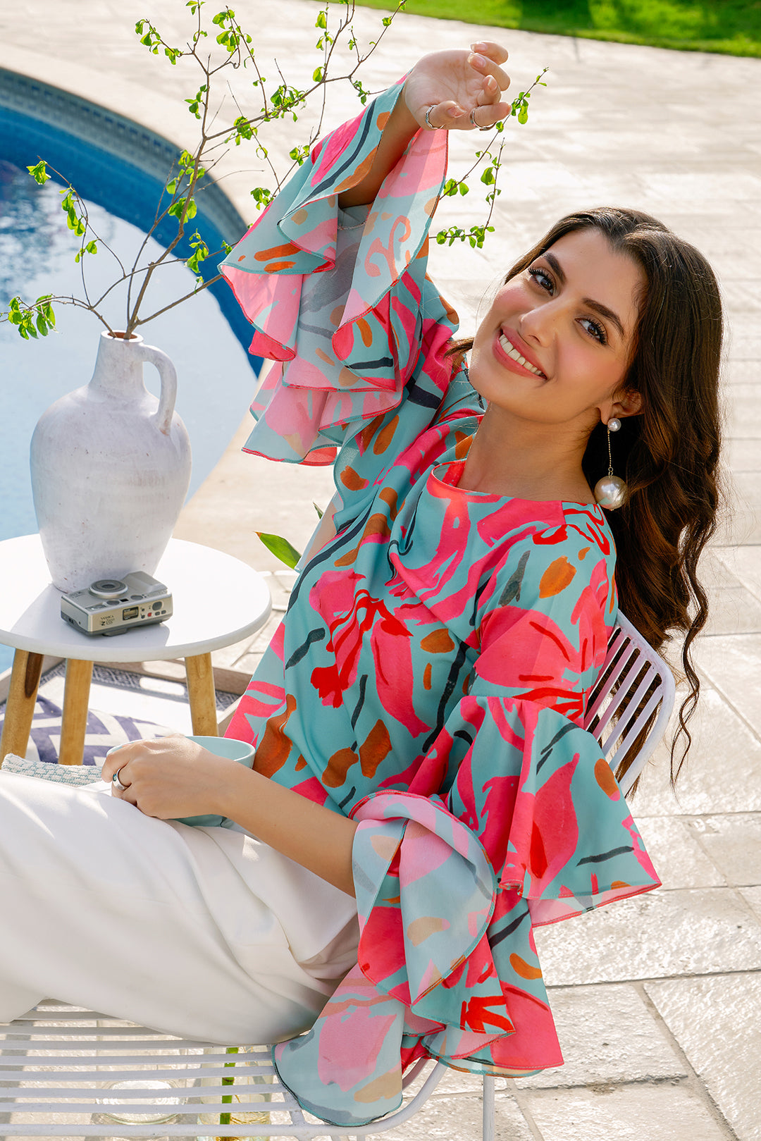 This top made in soft crepe fabric in an abstract print features a boat neck and full-length ruffle sleeves. Length 19". Model is wearing size S. Model height 5'4".