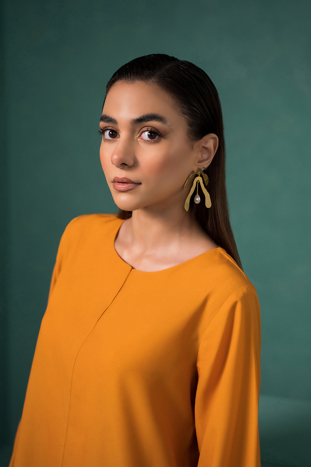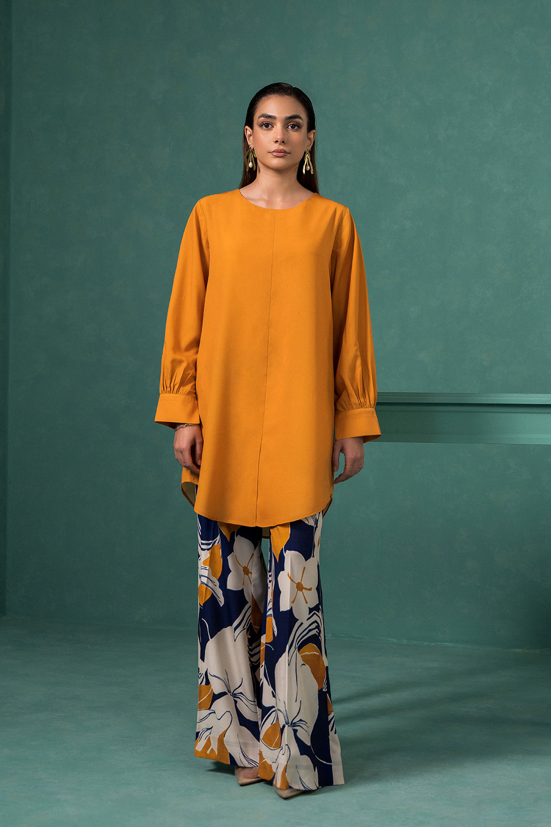 • This mustard top made in soft crepe fabric features crew neck with front slit, full-length sleeves with cuffs & a slit, round hemline, center seam with front slit.