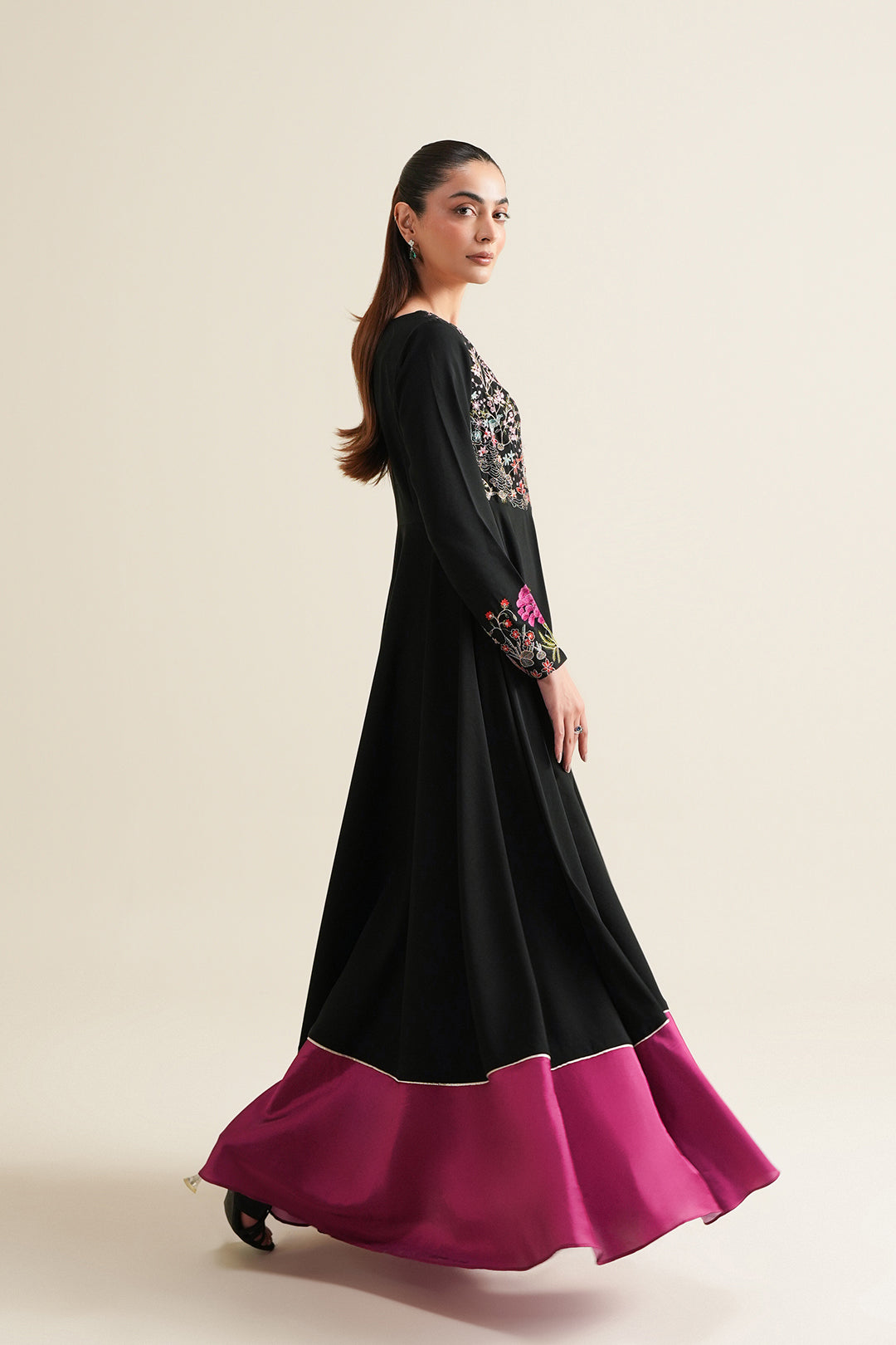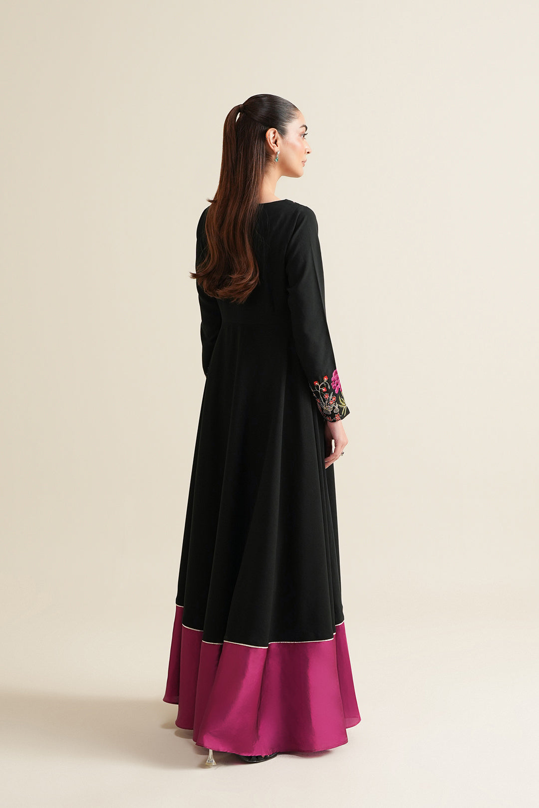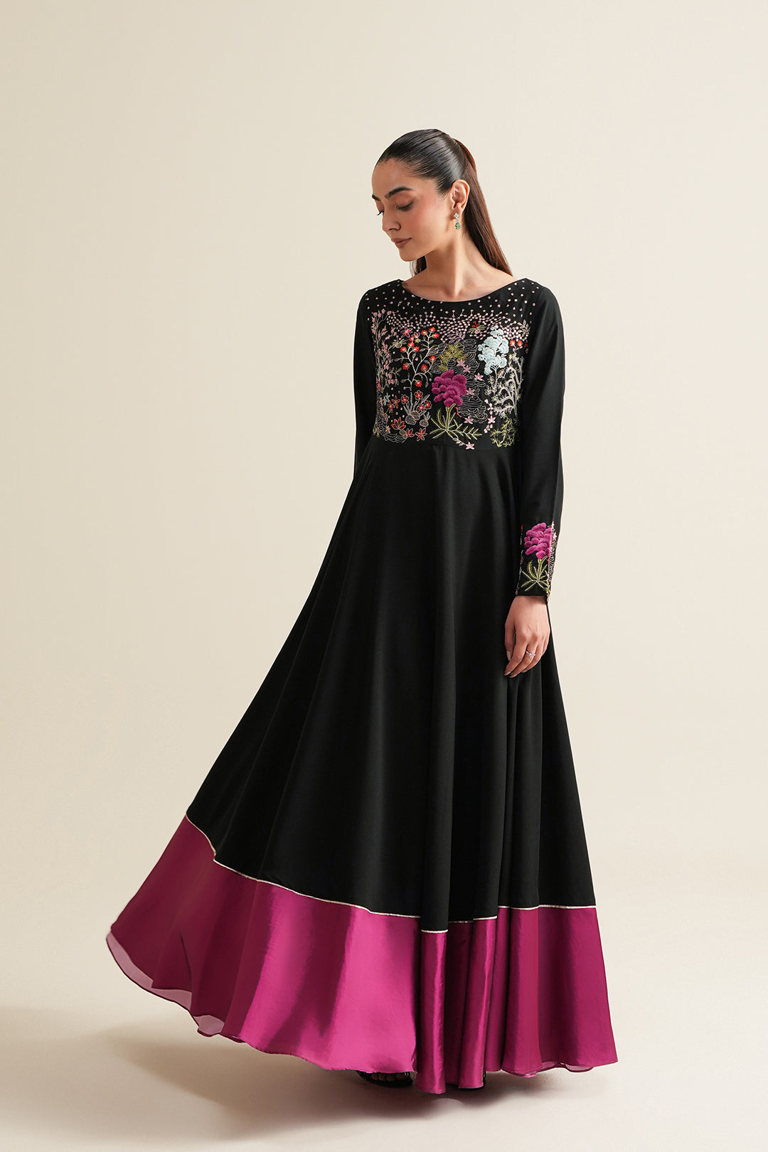 Crafted in black soft crepe fabric, this body-cut pishwas features a boat neckline with darts and basic full-length sleeves. Finished with embroidery on the front body and sleeves, and a pink color-block charmeuse silk panel at the hem.