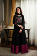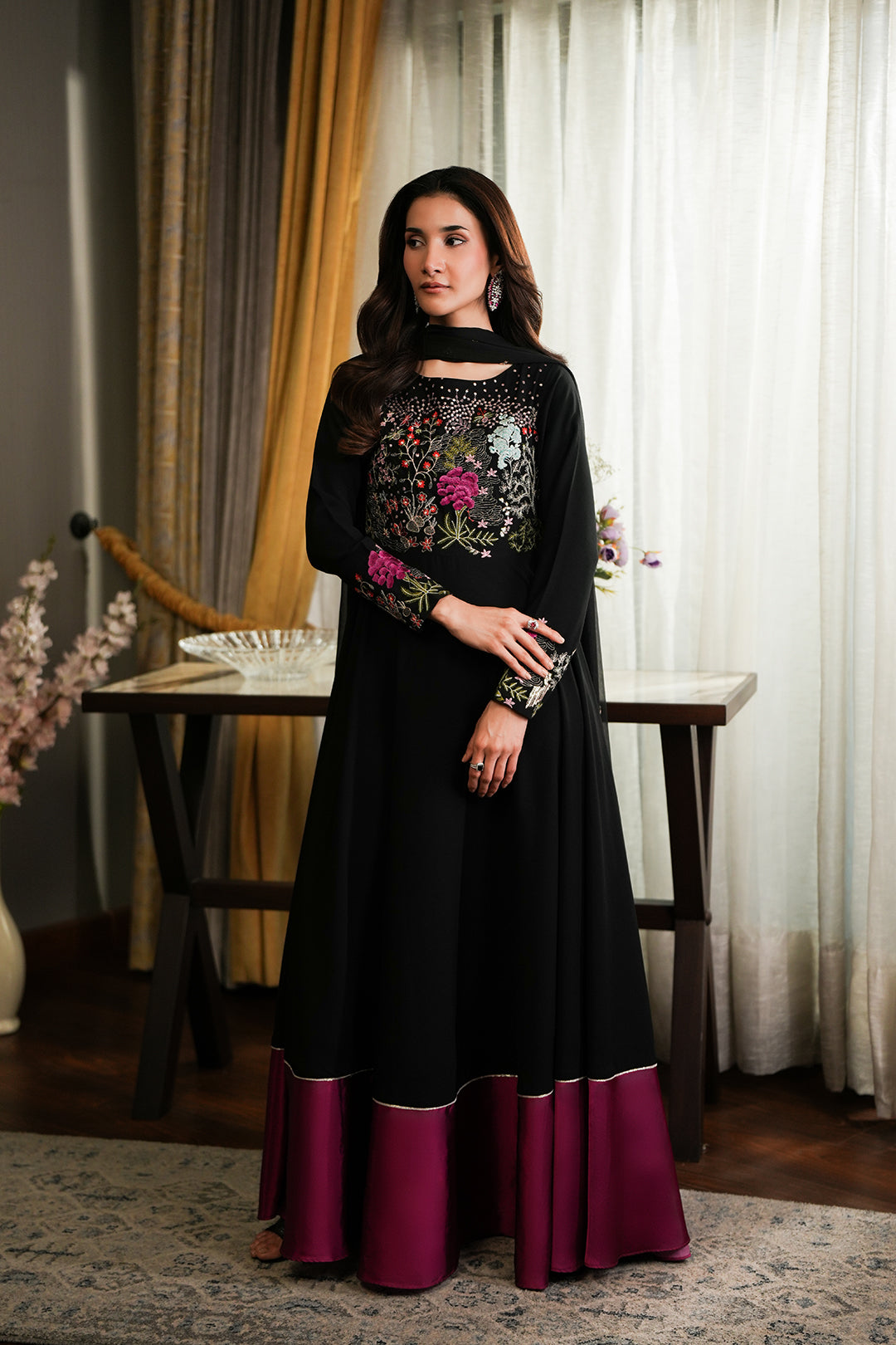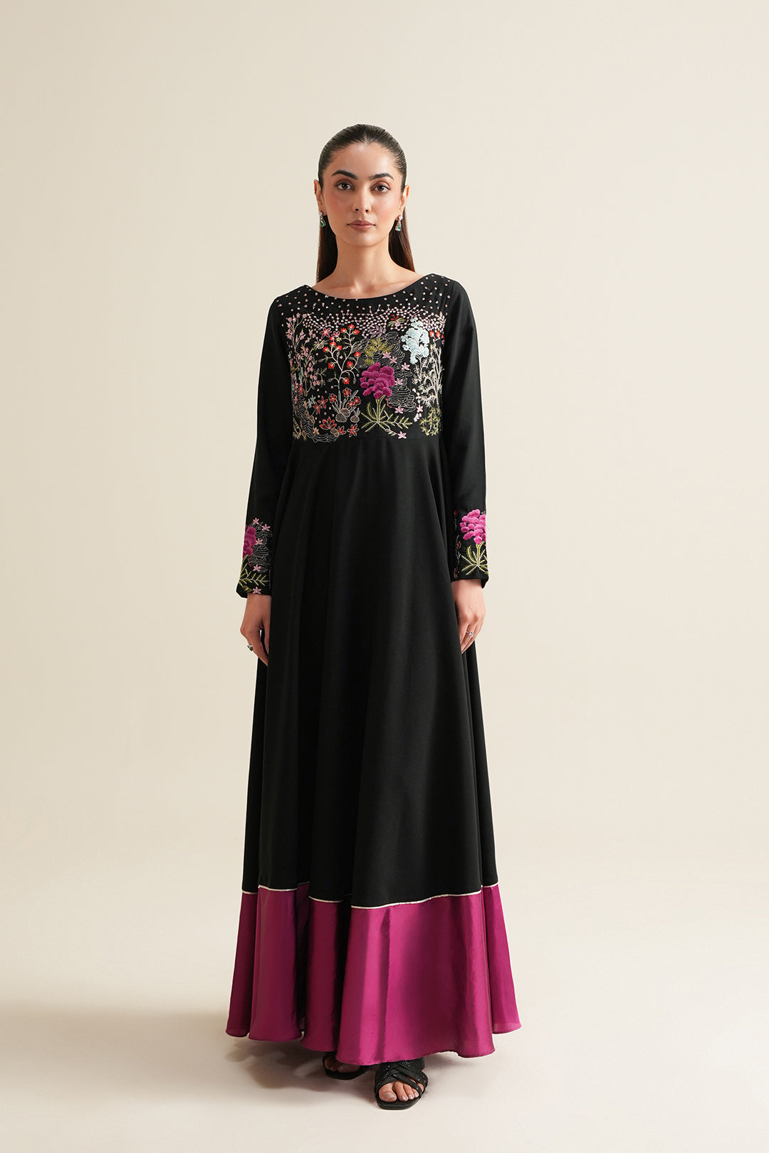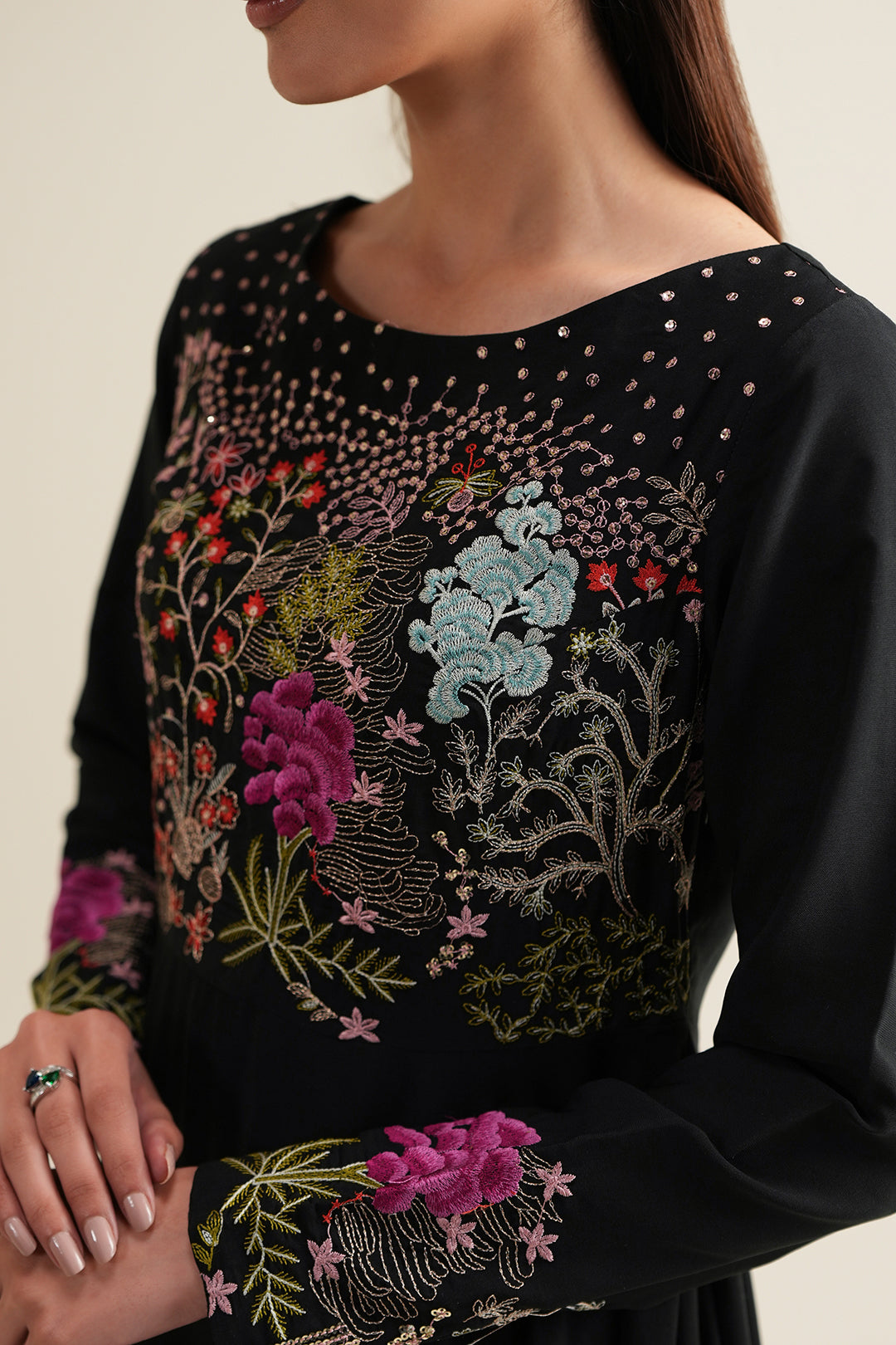 Crafted in black soft crepe fabric, this body-cut pishwas features a boat neckline with darts and basic full-length sleeves. Finished with embroidery on the front body and sleeves, and a pink color-block charmeuse silk panel at the hem.